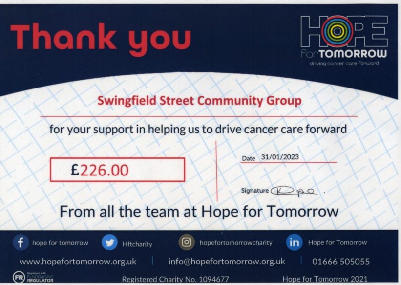 ‘Thank you so much for your generous donation…it is lovely of Swingfield Street Community Group to raise valuable funds for Hope for Tomorrow. Thank you!